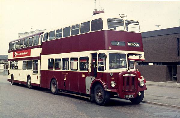 Old and new liveries are evident in this picture of Coventry 295, 295RW, a Metro-Cammell H34/29R bodied Daimler CVG6.