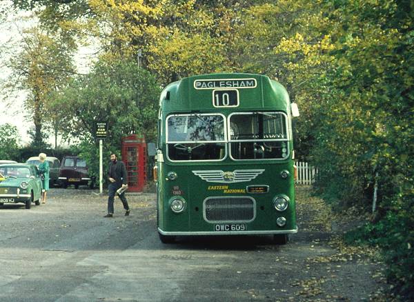 Eastern National 1963 Bristol MW/ECW 1360, OWC609, outside the Plough and Sail Inn at Paglesham on service 10.
