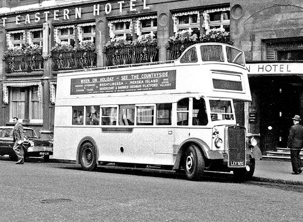 On the duty which fell to most open toppers each year, Eastern National 1111, LEV920, with Beadle body, waits outside the Great Eastern Hotel in Liverpool Street to pick up a party for the 1962 Derby.