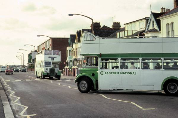 Eastern National KSW open-toppers 2379, WNO475 and 2382, WNO483, turning onto the sea front from Lifstan Way.
