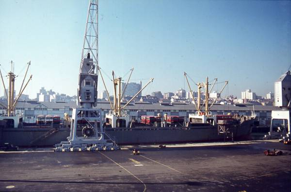 A collection of ex-SELNEC Leyland Panthers arriving at Woolloomooloo on MV Blanca. They were imported to Australia by J.J. Hill (dealer).