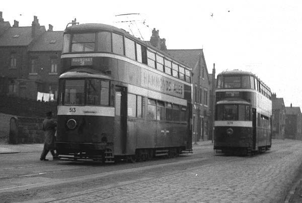 At the Kirkstall Abbey terminus, on the last day of the tram service, 509, by now repainted into standard livery, approaches the terminal stub whilst 513 is at the loading point for the return journey to Roundhay via the city centre. Both are ex-London Felthams built in 1931 as Metropolitan Electric Tramways 334 and 356 with Union Construction Company, Feltham 42/28 bodies and were ex-London Transport 2078 (509) and 2100 (513). Both entered service in Leeds in December 1950 and they were withdrawn on 29th December 1958 and 11th December 1957 respectively.