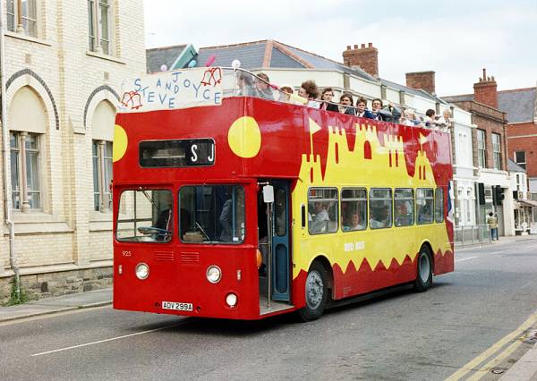 Ex-Devon General "seadog", originally 925, 925GTA (Admiral Blake) but by the time this photo was taken Red Bus 925, ADV299A, in Barnstaple on a wedding charter in summer 1986.