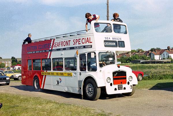Ex-Western National Bristol LDL open topper VDV753 as Eastern Counties OT2 at a Southend bus rally. It carries signwriting for the Felixstowe Seafront Special and a side route board advertising open top evening tours.