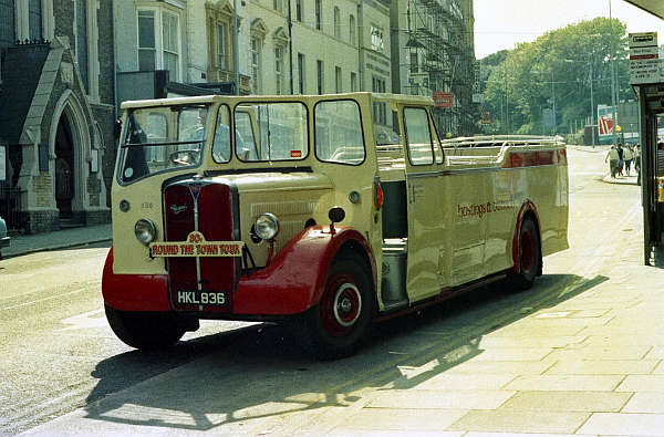 A second view of former Maidstone & District OR3, HKL836, a 1946 AEC Regal with Beadle body, converted to OB35F, seen here with Hastings & District on the Hastings Town Tour, probably in summer 1985.