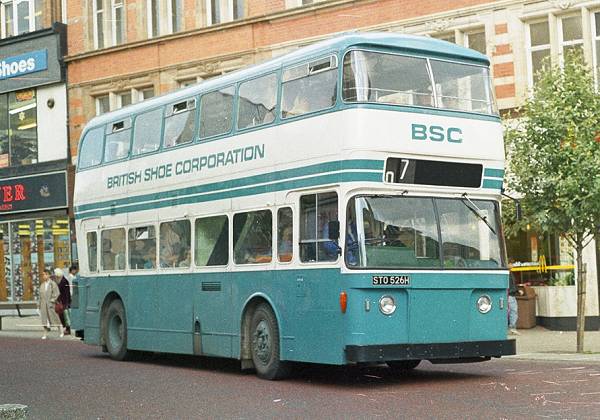 Ex-Nottingham 526, STO526H, with the British Shoe Corporation in the centre of Leicester in mid 1985. It was a Leyland Atlantean PDR1A/1 with Northern Counties H47/30D bodywork, new in July 1970.