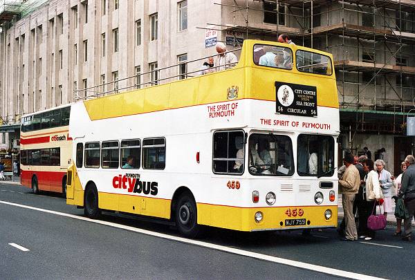 Plymouth 159, by this time renumbered 459, WJY759, and converted to open top, in the City Centre on the 54 City Centre-Sea Front Circular in summer 1986.