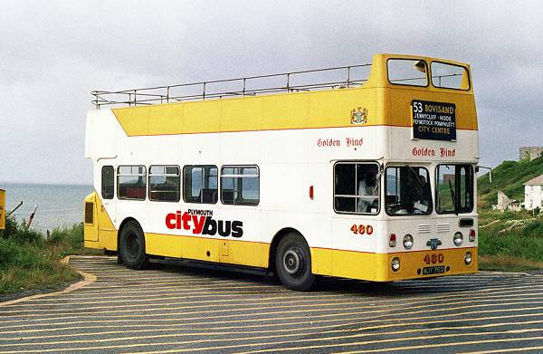 Plymouth 160, by this time renumbered 460, WJV760, and converted to open top, at the Bovisand terminus of the 53 City Centre-Bovisand in summer 1986.