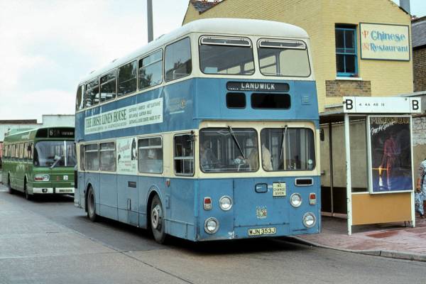 Southend Fleetline 353, WJN353J, in Southend Central Bus Station on a 4 to Landwick in mid 1982. This is one of the withdrawn vehicles reinstated during the 1982 rail strike.