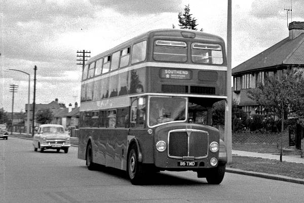 116TMD was a Bridgemaster demonstrator, here on loan to Southend Corporation in Rochford Road on service 8.