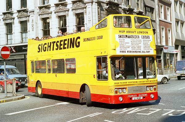 Atlantean/Roe LLH6K, with its roof removed, at Moorgate on the Culturebus London sightseeing tour.