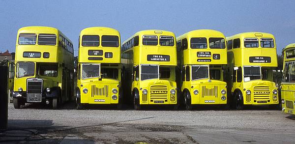 The scene in the yard at Lonsdale Coaches of Heysham. A number of vehicles working the Taylor Woodrow contract are visible. KTJ204C (ex-Lancaster East Lancs bodied Titan PD2/37), ASC659B (ex-Edinburgh Alexander bodied Titan PD3/6), ARN656C (ex-Preston Metro-Cammell bodied Titan PD3A/1), ASC652B (ex-Edinburgh Alexander bodied Titan PD3/6), TRN392 (ex-Preston Metro-Cammell bodied Titan PD3A/1) and the front of NUF450G (ex-Southdown Northern Counties bodied Leopard PSU3/1R) can just be seen.