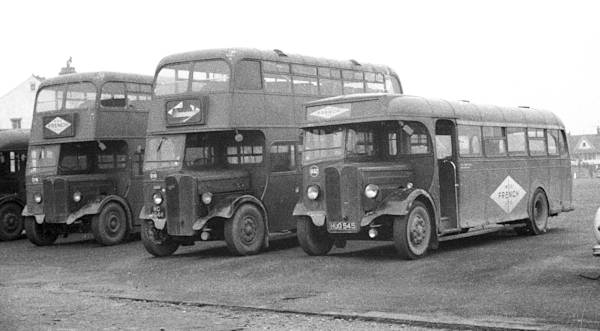 W&C French 1162, HUO545, an AEC Regal with Weymann B35F body new in 1948 to Devon General and withdrawn by them in 1959 and to its right, 1937 AEC Regent RC4644 with post-war Willowbrook L55R body, ex-Trent in 1960.