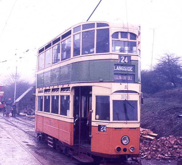 Not seen in service at Crich since 1976 is Glasgow 1100, a Kilmarnock Bogie car built by Hurst Nelson in 1928 and rebuilt with streamlined ends in 1941.