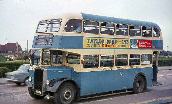 Still wearing the pre 1965 livery, the bus stands at Shoebury Common with a correct set of intermediate displays but in reverse order, awaiting departure time on a journey to Victoria Circus.