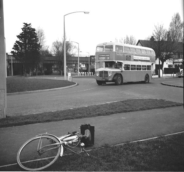 Southend Bridgemaster 319, WHJ430 - not a brilliant picture of 319 but included for its nostalgic view of my bike at the then newly built roundabout.