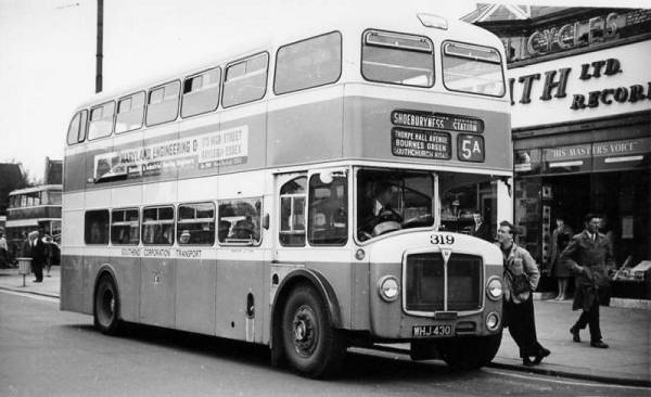 Southend AEC Bridgemaster 319, WHJ430, one of four new in 1960. Click here for more details from the Southend fleet list pages.Photographer unknown, Ian Banks collection, early 1960s, Victoria Circus, Southend See the Site Map for further details about copyright.