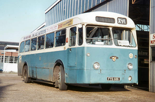 On offside view of Southend 213, FYS686, an ex Glasgow Worldmaster back in the garage labelled up for an outing on the X91.