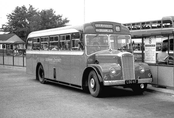 Dating from 1954, LOU67 was one of fifteen Dennis P5 Falcons with Strachan B30F bodies. Seen in Guildford (Farnham Road) Bus Station 239 is loading for Loxwood on service 49.