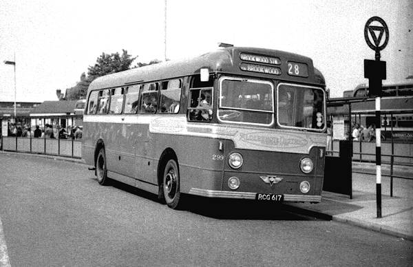 One of thirty AEC MU3RV Reliances with Weymann B43F bodies delievered in 1957 is seen in Guildford (Farnham Road) Bus Station. 299, RCG617, was converted to B41F (OMO) the year following this photograph.