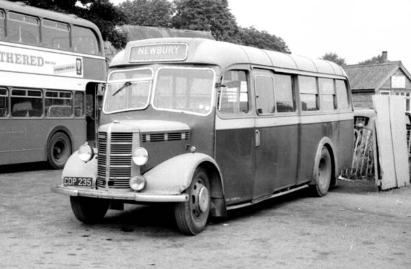 Stout (Valentine Coaches), Shalbourne CDP235, seen at The Wharf, Newbury, was a Bedford OB with a Duple B30F body which had been new in May 1946 as Reading 17 and was converted to B28F at an unknown date.