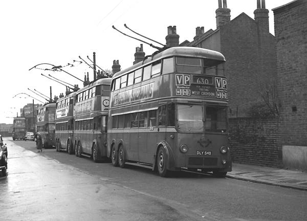 London Transport D3 Class 549, DLY549, leading a lineup of trolleybuses at Letchford Gardens, Harlesden