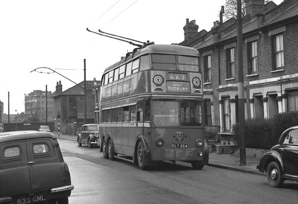 London Transport Class E1 trolleybus 554, DLY554, numerically the first of it's class, at Letchford Gardens , Harlesden