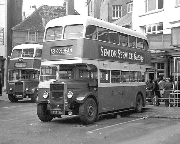 Southdown, Brighton 201, EUF201, was a Leyland TD5 new in 1938 with a Park Royal H28/24R body. It was rebodied in 1950 with an East Lancs H28/26R body and is seen in Pool Valley at Brighton.