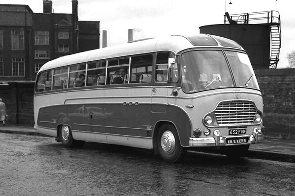Kerr, Newcastle 852FVK was a Commer Avenger IV with a Duple Corinthian C41F body seen on Ebury Bridge awaiting the start of the the 1959 British Coach Rally.