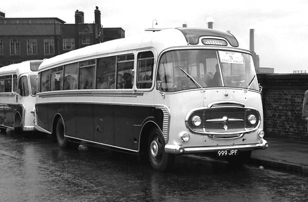Comfy Coaches, Farnham 999JPF was a Bedford SB3 with Plaxton Consort IV C37F bodywork seen on Ebury Bridge awaiting the start of the the 1959 British Coach Rally.