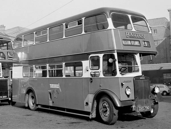 Seen on the parking area at Mount Street/Granby Street, Nottingham is Barton, Chilwell 790, XVO790, which was a Leyland PS1/B with a Northern Counties L31/30RD body new in June 1958.