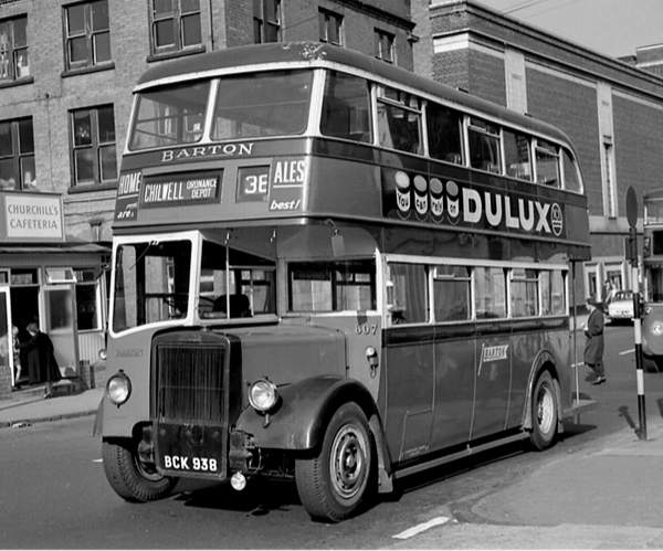Acquired in March 1959 from Preston where it had been numbered 105, Barton, Chilwell 807, BCK938, was a Leyland PD1A with a Leyland L27/26R body new in 1947.