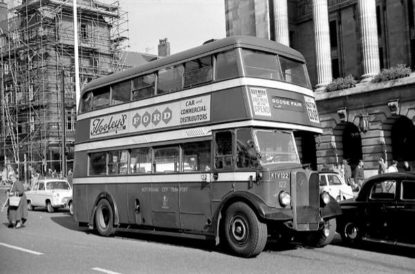 Nottingham 122, KTV122, an A.E.C. 9612E Regent III with an M.C.C.W. H30/26R body new in July 1949 is seen passing the Council House, having just crossed Long Row after emerging from King Street.