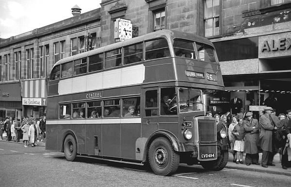 Central S.M.T. L294, CVD494, new in 1950, was a Leyland PD1A with a Northern Counties L27/26R body, one of nine delivered that year from a batch of twenty delivered between 1948 and 1950. It is seen in Quarry Street, Hamilton.