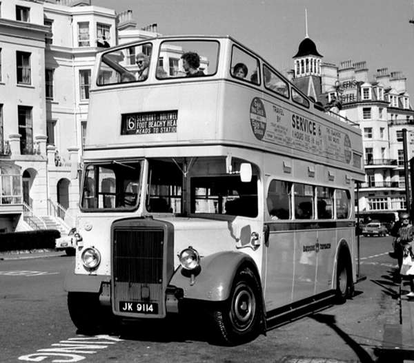 Eastbourne 16, JK9114, seen at Eastbourne Pier/Grand Parade, was a Leyland PD1 with an East Lancs body which was H28/24R when new in 1946. It was rebuilt to O30/26R in 1961.
