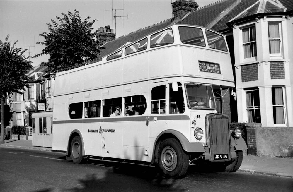 Eastbourne 18, JK9116,was a Leyland PD1 with an East Lancs body which had been H28/24R when new in 1946.