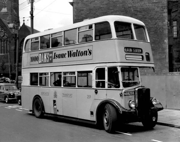 Newcastle 259, NBB259, was an A.E.C. 9612E, Regent III with a Northern Coachbuilders H30/26R body new in September 1949.