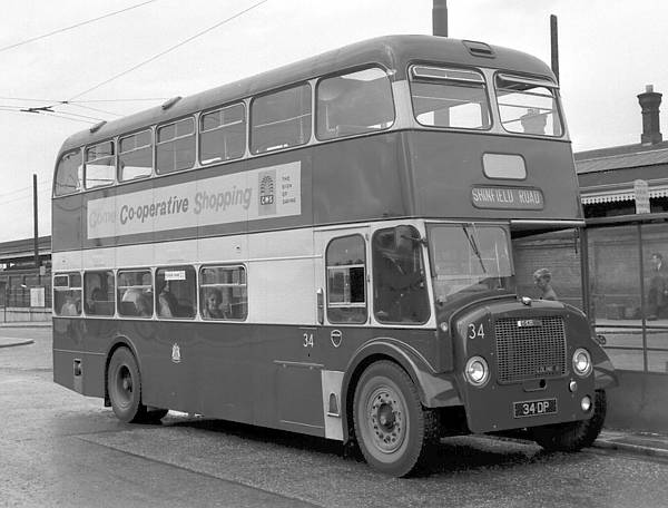 Reading 34, 34DP, a Dennis Loline III with an East Lancs H38/30F body was new in 1962 and is seen outside the station in Reading.