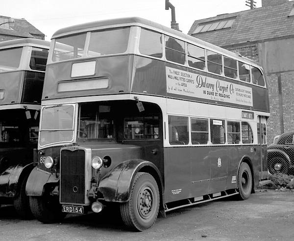 Twelve Crossley DD42/8s with Crossley L26/26RD bodywork featured in the Reading fleet and seen here at the garage are 85 and 89, ERD154/8, new in 1950.