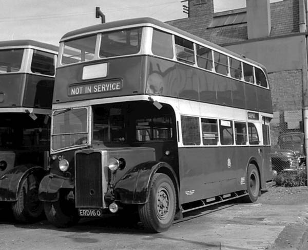 Reading purchased twelve Crossleys in 1950, and 91, ERD160, a Crossley DD42/8 with a Crossley L26/26RD, was the eighth of the batch and was new in December 1950.