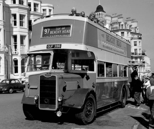 It was converted to open top, as O30/26R in March 1952 and was fitted with a Gardner 6LW engine in May 1957. Seen here at Eastbourne Pier/Grand Parade, it was withdrawn in 1964, passing to Cowley (dealer), Salford in June.