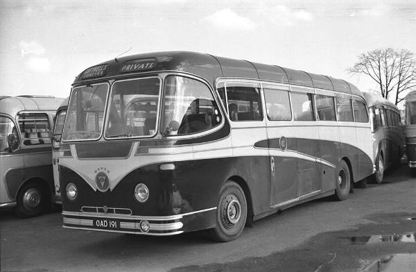 OAD191, a Duple Elizabethan C41C bodied A.E.C. MU3RV Reliance was new to Cottrell, Mitcheldean in July 1954 and was seen at the Council Depot, Craneford Way, Twickenham.