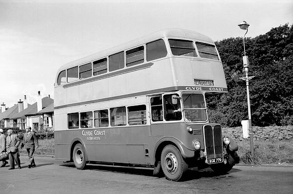 KGK779, seen here with Hogarth, Saltcoats (Clyde Coast), was an A.E.C. O961 Regent III with a Cravens H30/26R body new to London Transport Executive in April 1950 as RT1520.