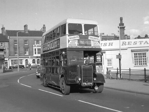 Guy Arab FBJ374, number 6 in the Lowestoft fleet, was the last of six Guy Arab IIs new in 1945 and had a Massey H30/26R body.
