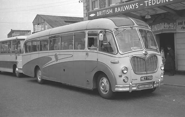 Thomas, West Ewell NET750 was a Bedford SBG with a Duple C41F body new in 1956. It was acquired from Lacey, London E.6 in June 1964 and is seen at Teddington whilst on railway replacement work.