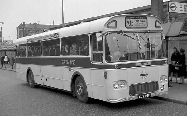 London Transport Green Line RC8, CUV66C, seen at Butterwick, Hammersmith was an A.E.C. 4U2RA Reliance with a Willowbrook DP49F body.