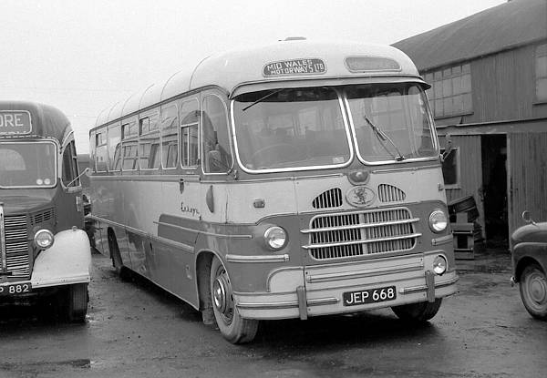 Mid-Wales Motorways JEP668 was a Bedford SB1 with a Yeates Europa C41F body new in March 1959 and is seen at the main garage in Newtown.