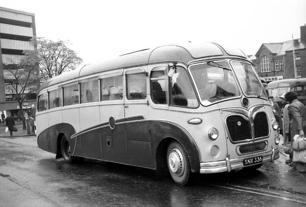 Williamson, Shrewsbury acquired SNX336 in March 1966 from Ashley, Dawley, who had in turn acquired it from Edwards, Llanrwst in October 1962. This Bedford SBG with a Duple Vega C37F body had been new to Wainfleet, Nuneaton in July 1955 and passed to Edwards in August 1962.