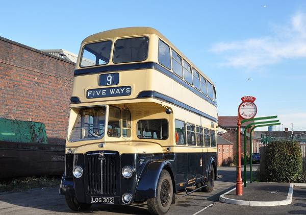 Former Birmingham Corporation 3002, LOG302, is a 1954 Daimler CL5 with Metro-Cammell H30/25R body, restored to full livery complete with the "Forward" City Coat of Arms.
