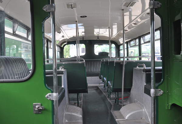 Bristol Lodekka 969EHW, Bath Services L8515, taken from outside the rear window to show interior lower detail and sunken aisle. The doors were closed which helped avoid window reflection.